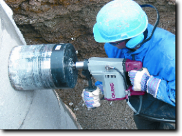 Bis ein Loch nach der bisherigen Methode (Rohrbohrgerät) gebohrt ist, hat man hier 3 Löcher gebohrt. Kein Befestigen, kein großartiges Ausrichten, kaum Gewicht, wenig Platzbedarf, aber unglaublich schnell, z.B. ein Ø 250 mm-Loch in den Beton-Kanal bei 10 cm Wandstärke ca. 12 Minuten, und das handgeführt! Traumhaft, das muss man gesehen haben! So sieht Wirtschaftlichkeit aus.